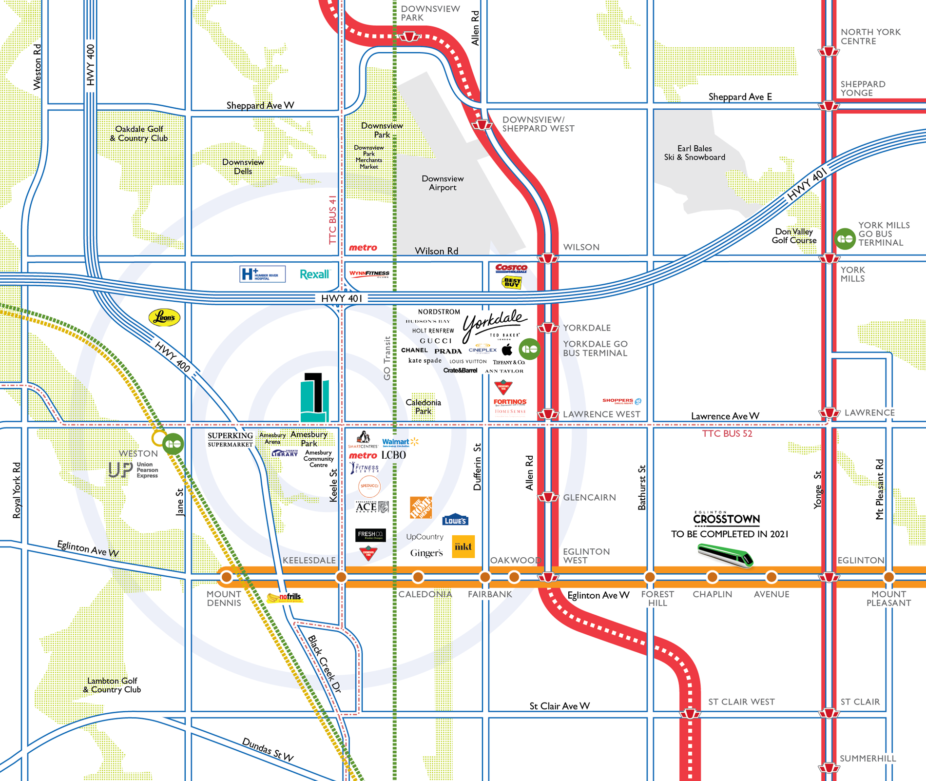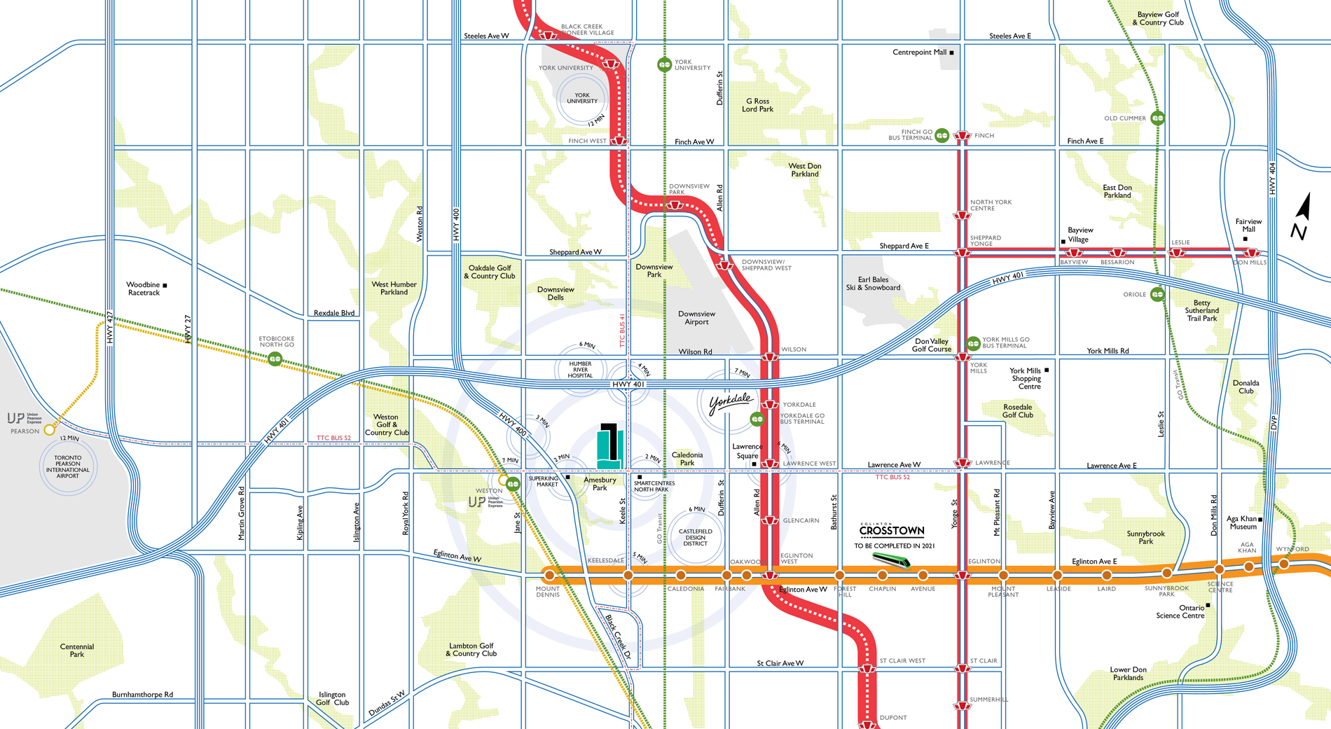 Whether you’re commuting to downtown, driving up town or leaving town, getting around couldn’t be easier. For drivers, there’s excellent access to both the 401 and the 404, and if you’re taking transit, you pretty much have every option in the book.